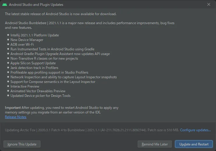 Android Studio Bumblebee (2021.1.1) への更新は、途中いくつかコンフリクトは起きたものの、画面の指示に従うだけで特に問題なく完了することができました。いまのPCにArctic Foxをクリーンインストールした時はいろいろ苦労したので、今回も苦労するかと心配していましたが杞憂でした。これから更新される方も、Webサイトからインストーラをダウンロードして手動でインストールするより、Android Studio内の指示に従って更新するほうが安全かもしれません。