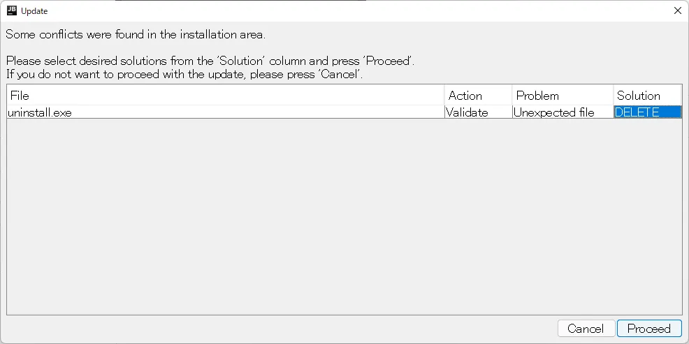こんなん出ました。。。コンフリクト。。。Solutionを選べって書いてありますが、DELETEから変更できないです。仕方ないのでこのまま「Proceed」をクリックします。