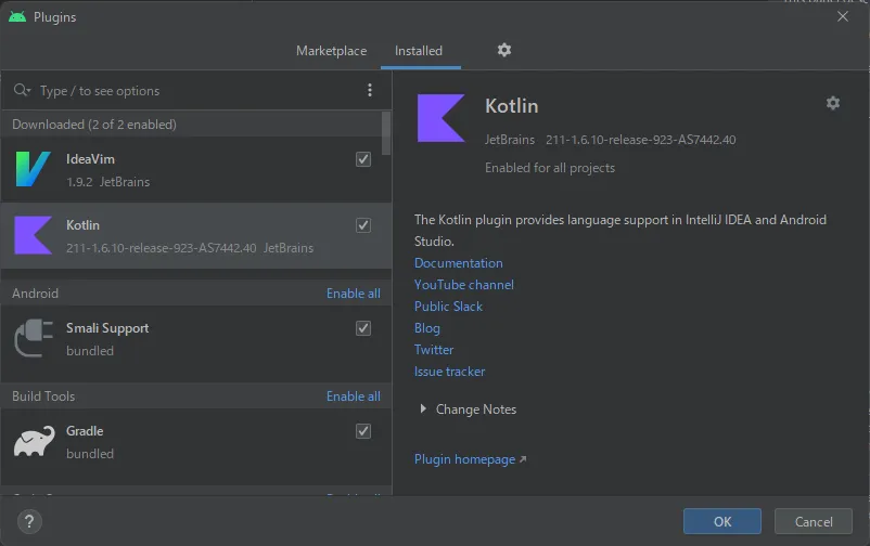 Kotlinプラグインの更新も同時に行われるようです。Kotlin自体のバージョンは1.6.10で変わりませんが、先頭の数字が203から211になっています。これはおそらく、IntelliJのバージョンが2020.3から2021.1になっていることに対応しているのだと思います。