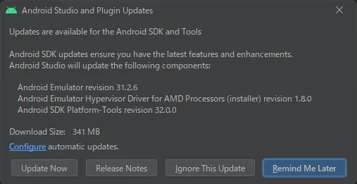 さて、Android Studioは無事アップデートできたようですが、画面右下に「Android Studio and plugin updates available」という通知が表示されています。Android Studioはさっき更新したんじゃ・・・と思いましたが、EmulatorなどAndroid Studio本体以外のコンポーネントの更新について言っているみたいです。「Update…」をクリックします。