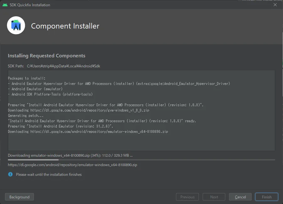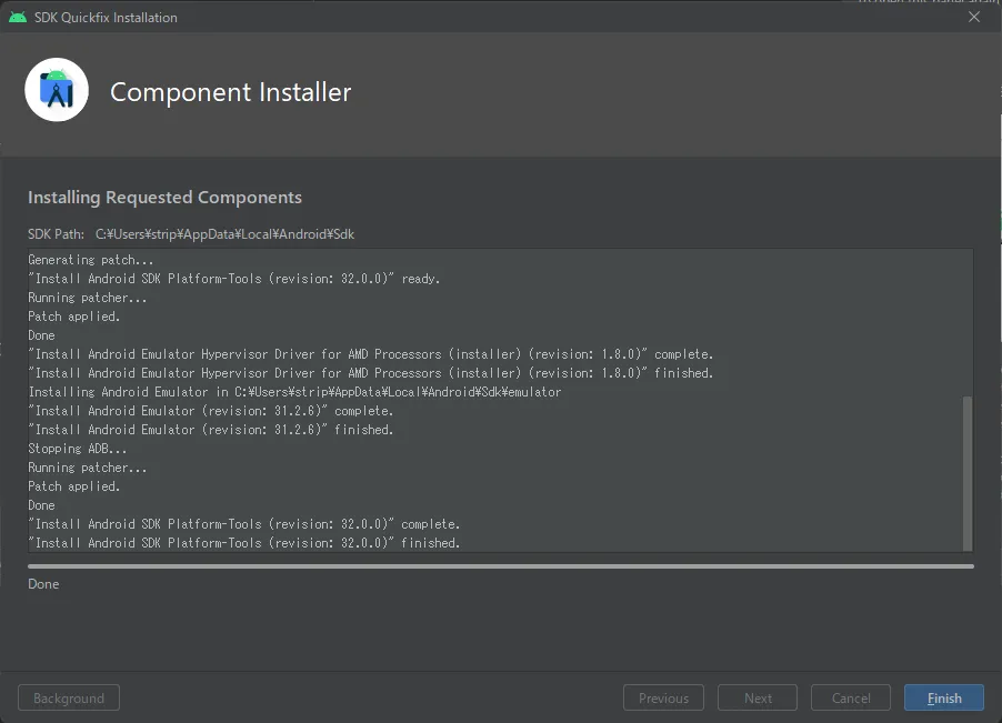 ツール類のインストールが一通り終わりました。「Finish」をクリック。