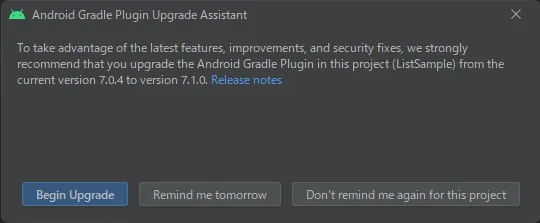 さらに、Gradleプラグインのアップデートの案内も表示されました。これもまだリリースノートは英語しか公開されていません。トップレベルbuild.gradleがsettings.gradleになるなどの変更があるようです。ただそれがどんな影響を与えるのか、正直よくわかりません。このあたりはまだまだ勉強不足です。。