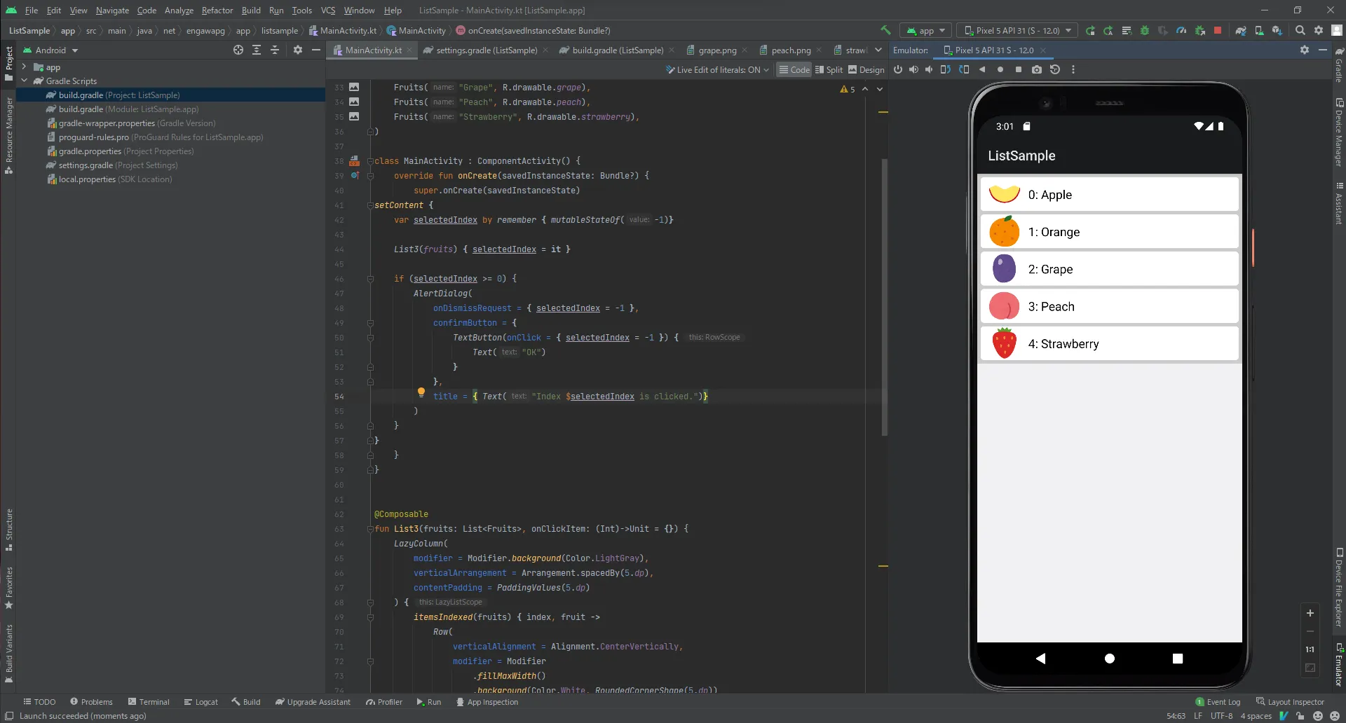先日公開した「Jetpack Compose入門(17) リスト」で紹介したサンプルをエミュレータで実行してみました。以前、Android Studioを更新したらエミュレータが動かなくなったことがありましたが、今回は問題なく動きました。エミュレータはAndroid Studioのウィンドウ内で起動しました。Arctic Foxの時は確かデフォルトは別ウィンドウで、自分で設定すればウィンドウ内に統合して表示されたような記憶があります。今回のBumblebeeでは統合ウィンドウがデフォルトになったようですね。Android Developers Blogの記事にも載っていました。