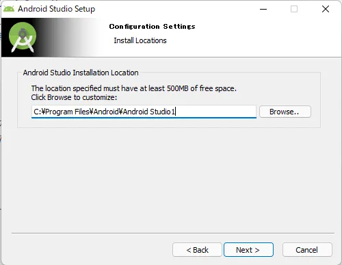 既存のAndroid Studioフォルダではなく、「1」のついたフォルダを新しく作ってインストールしようとしていました。前のバージョンを残しておく必要はないので、同じフォルダに上書きインストールしてみようと思い、「1」を消してNextをクリックすると、