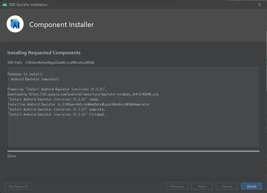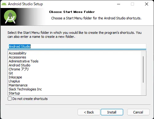 仕方ないので最初の指示通り「Android Studio 1」フォルダにインストールすることにして、先に進みます。Installをクリック。