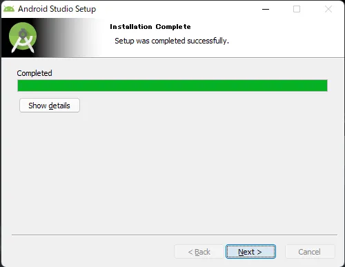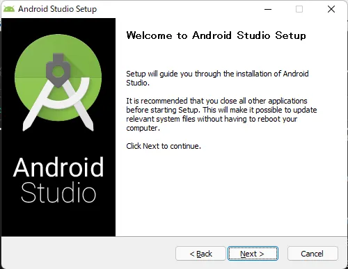 既存のAndroid Studioをいったん終了し、ダウンロードしたexeファイルを実行し、Next。