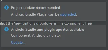 EmulatorとGradle Pluginの更新案内が出ていますので、順に更新します。