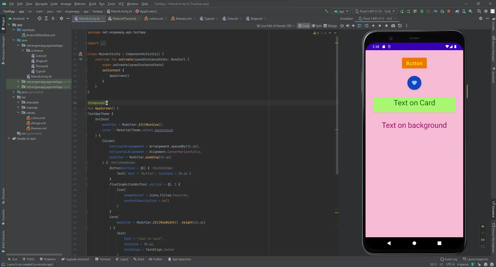 ちなみに実行したのは、Jetpack Compose入門の最新記事「テーマカラーの適用」のサンプルです。よかったらそちらもご覧ください。