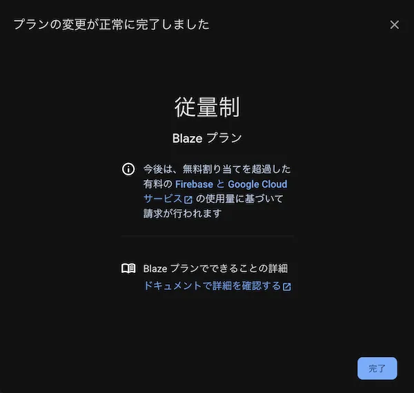 Vertex AI Gemini APIを利用するには、従量課金制のBlazeプランを適用する必要があります。「アップグレード」をクリックし、支払い方法を選択して購入を確定し、プランの変更を完了させます。
