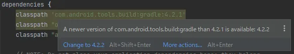 元が4.2.1を使っていたので、build.gradleの該当箇所にマウスを当てると4.2.2へのアップデートを勧められますが、