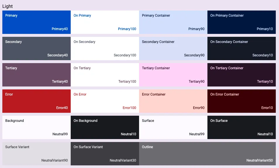 M3ではテーマで定義できる色の種類が大幅に増えました。M2とM3でそれぞれ使える色の定義をMigrating to Material Design 3から転載します。colorPrimaryVariantとcolorSecondaryVariantは廃止されています。先ほどTheme.ktの移行で触れたように、これらの色を使っている場合は対応が必要になります。colorPrimaryVariantはステータスバーの色などに使われることが多かったですが、M3ではステータスバーとTopBarは同じ色にすることが推奨されているので、colorPrimaryVariantが廃止になっています。