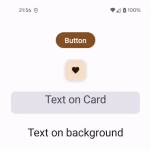 Material Theme Builderでは指定した色そのままではなくてちょっと鮮やかさを抑えた色がPrimaryになるので、全体的にちょっと地味になってしまいますね。ボタンではなくコンテンツを目立たせるには、これくらいのほうがいいのかもしれませんが、アプリの内容によってはもう少しアクセントの効いた色が欲しくなる気もします。この辺りは調整次第だと思います。