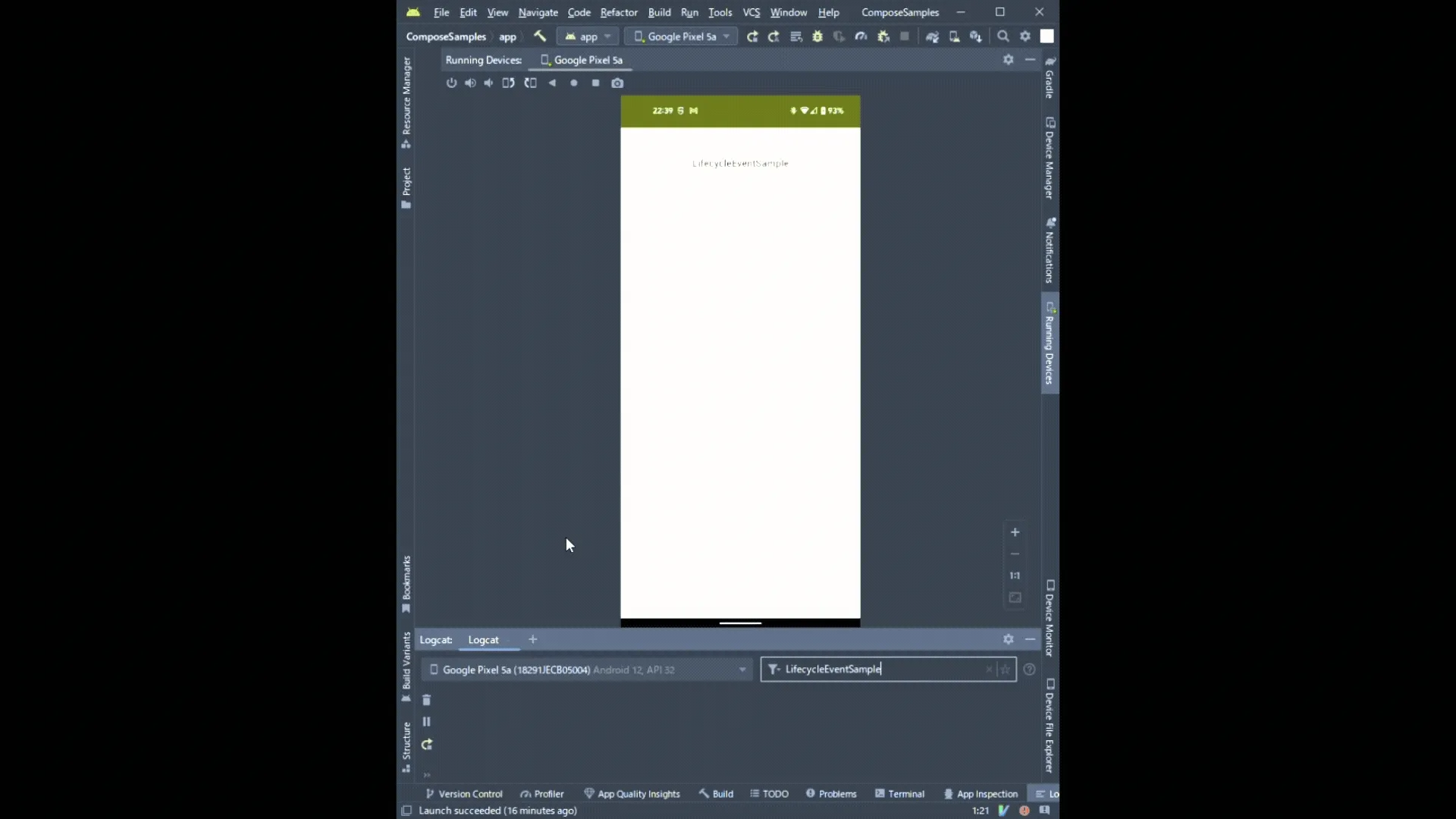 @Composablefun LifecycleEventSample() { Text( text = "LifecycleEventSample", ) ObserveLifecycleEvent { event -> // 検出したイベントに応じた処理を実装する。 when (event) { Lifecycle.Event.ON_RESUME -> Log.d("LifecycleEventSample", "On Resume") Lifecycle.Event.ON_PAUSE -> Log.d("LifecycleEventSample", "On Pause") else -> {} } }}次はObserveLifecycleEvent()を使う側です。こちらは簡単です。コールバックに、検出したイベントに応じた処理を書いてあげればOKです。