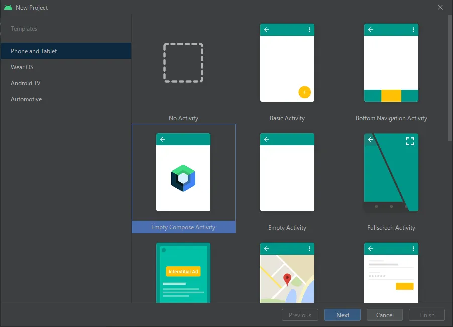 テンプレートはEmpty Compose Activityを使います。Hello World! テンプレート利用編で説明した通り、File > New > New ProjectからEmpty Compose Activityを選択してプロジェクトを作成します。