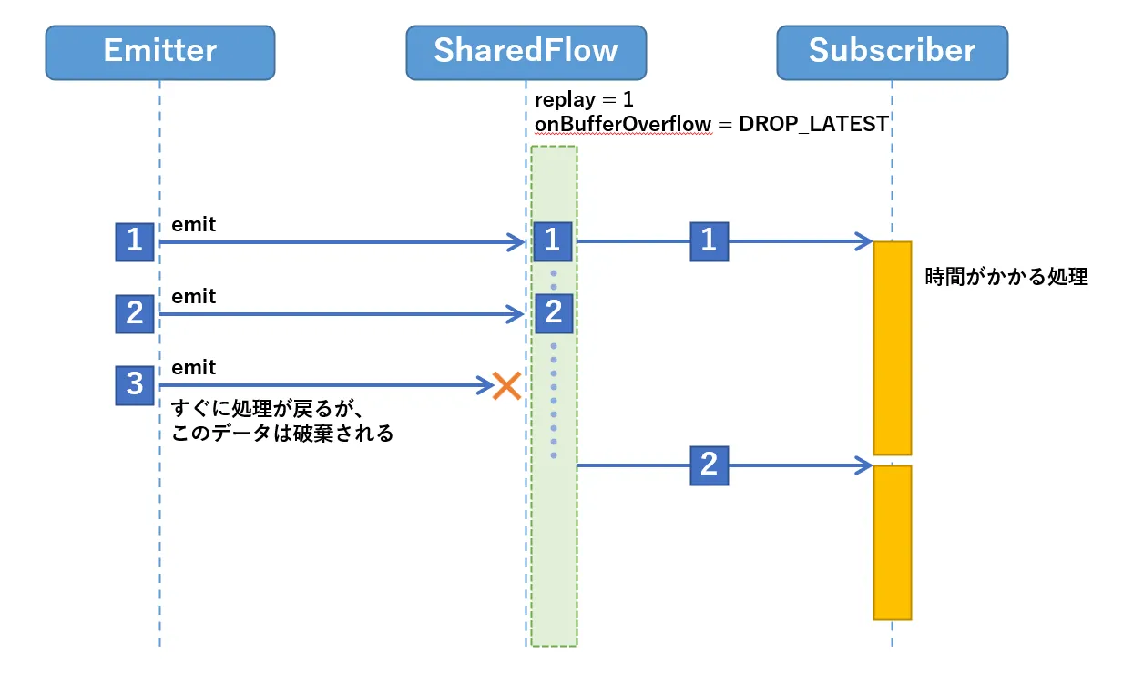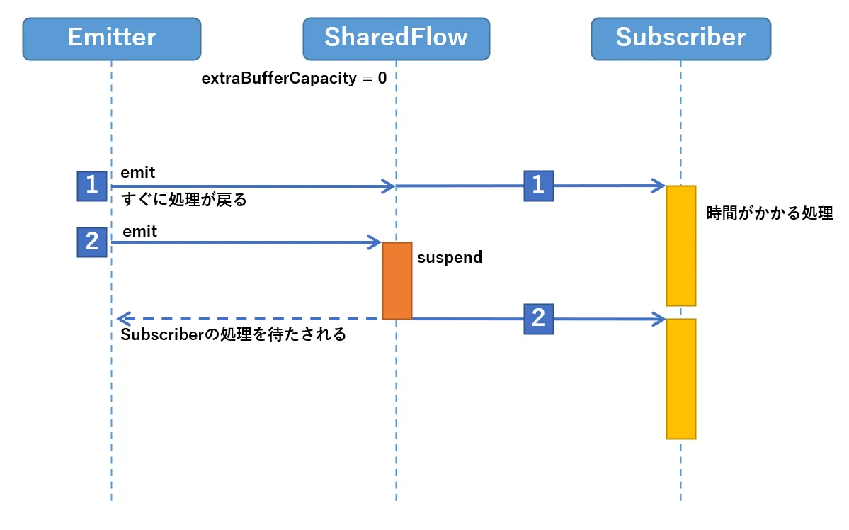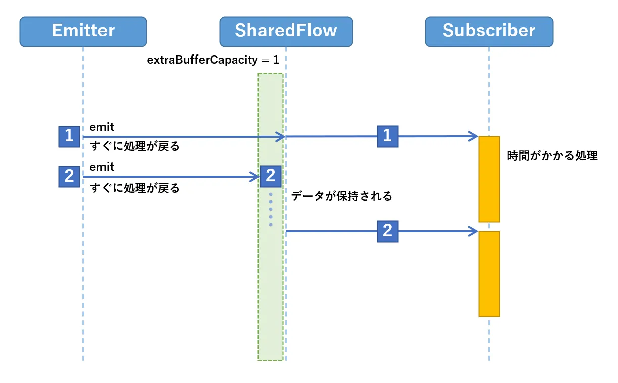 extraBufferCapacityはemitされた値を格納しておくバッファのサイズです。Subscriberの処理を待っている間、このバッファに値をためておくことができます。
