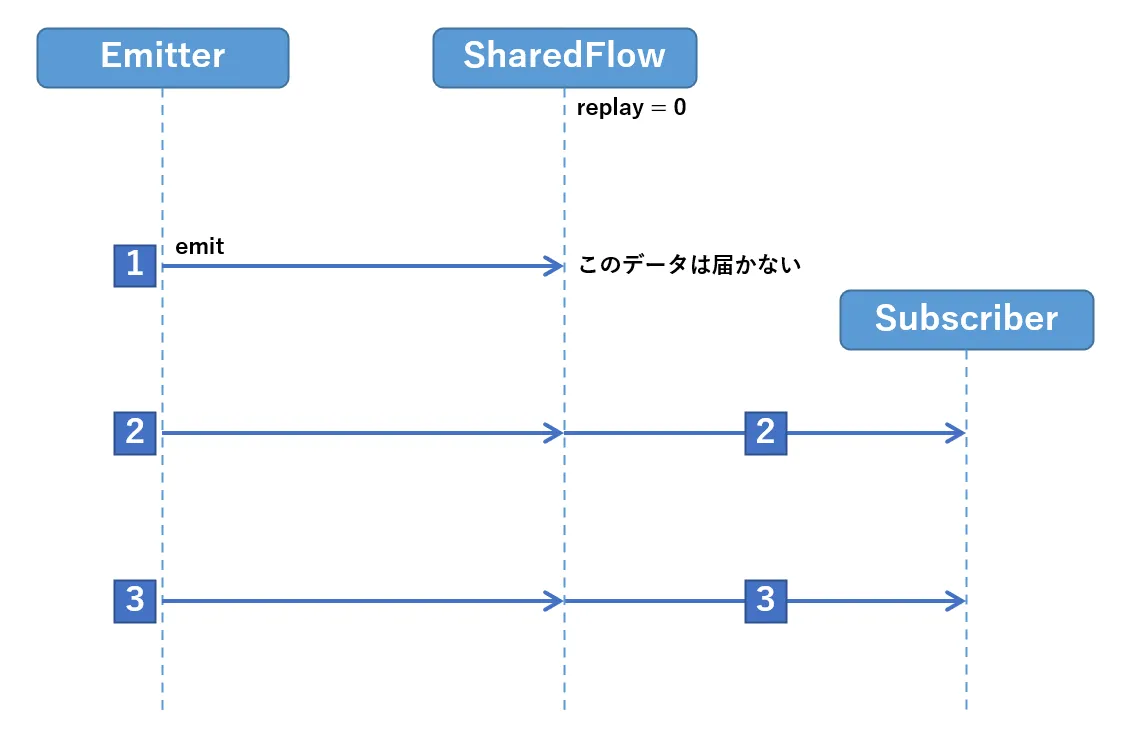 replay = 1の場合、Subscriberが存在してもしなくても、最後にemitされた値が1つSharedFlow内に保持されます。そして、Subscriberが新たに収集を開始すると、バッファに保持されている値がまず出力され、その後はEmitterからemitされたタイミングで出力されます。