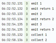 init { viewModelScope.launch { sharedFlow.onEach { delay(3000) Log.d("FlowSample", "collect $it") }.collect() } viewModelScope.launch { repeat(2) { delay(1000) Log.d("FlowSample", "emit $emitValue") sharedFlow.emit(emitValue) Log.d("FlowSample", "emit return $emitValue") emitValue++ } }}