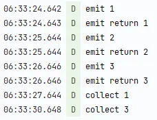 init { viewModelScope.launch { sharedFlow.onEach { delay(3000) Log.d("FlowSample", "collect $it") }.collect() } viewModelScope.launch { repeat(3) { delay(1000) Log.d("FlowSample", "emit $emitValue") sharedFlow.emit(emitValue) Log.d("FlowSample", "emit return $emitValue") emitValue++ } }}