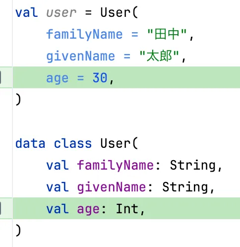 // 呼び出し側val user = User( familyName = "田中", givenName = "太郎", // trailing comma)Trailing commaの最大のメリットは、引数の追加、削除、入れ替えをした時のGitのdiffが見やすくなることだと思います。