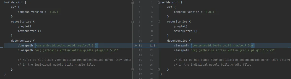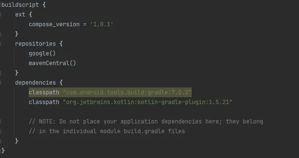 プロジェクトのbuild.gradleを見ると現在のgradleのバージョンは7.0.2になっており、ここにも更新があることを示す黄色いハイライトが表示されています。