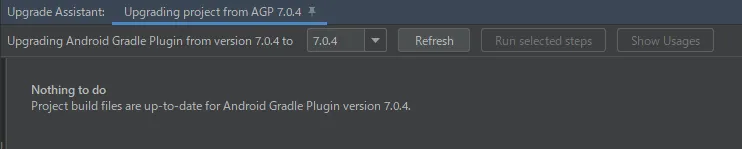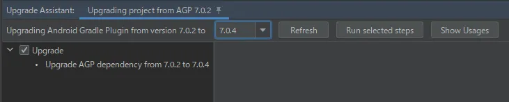 最初に見たメッセージの”upgraded”をクリックすると、Android Gradle Plugin Update Assistantが出てきました。