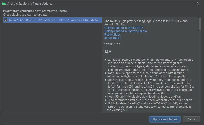 Kotlinプラグインの更新も同時に行われるようです。Kotlin自体のバージョンは1.6.10で変わりませんが、先頭の数字が203から211になっています。これはおそらく、IntelliJのバージョンが2020.3から2021.1になっていることに対応しているのだと思います。
