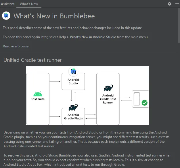 起動しなくなったらどうしようと思いましたが、そのまま何事もなくインストールが進んでいき、Android Studioが起動しました。「What’s New in Bumblebee」が表示されているので、どうやら更新に成功しているようです。