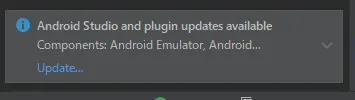 それではさっそく更新してみます。Android Studio内に通知が出ているので、「Update…」をクリックします。