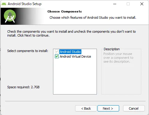 既存のAndroid Studioをいったん終了し、ダウンロードしたexeファイルを実行し、Next。