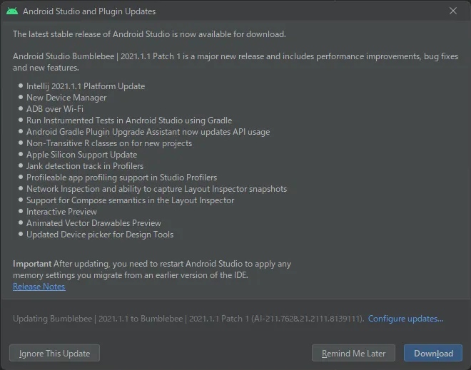つい先日、Android StudioをArctic FoxからBumblebeeに更新したばかりですが、もうPatch 1がリリースされました。早速適用したので、手順などを紹介します。