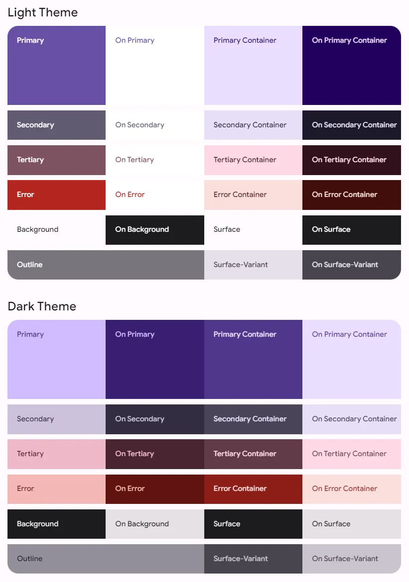 まずはM3のカラーテーマがどのような要素で構成されているのか、使われる用語の意味も確認しながら整理します。