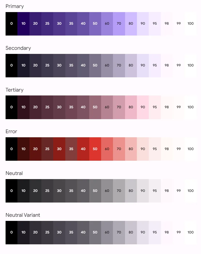 キーカラーのうちPrimary、Secondary、Tertiaryの3色を「アクセントカラー」と呼び、Neutral、Neutral Variantの2色を「ニュートラルカラー」と呼びます。