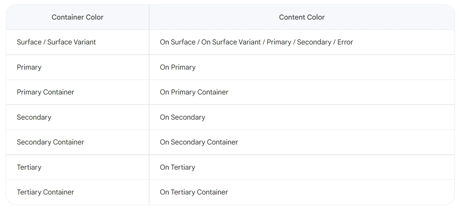 そういった場合には、Theme Builderで作成してダウンロードしたソースコードの一部を変更して使うことになると思います。その時は、コンテナとコンテンツの関係になって(入れ子になって)使われる可能性のあるロール同士のコントラストが確保されるよう注意します。そういったロールの組み合わせはMaterial Design 3のColor Themingページに記載されています。
