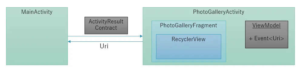 PhotoGalleryFragmentを表示するPhotoGalleryViewModelからURI選択イベントを受信したら、呼び出し元のMainActivityにURIをActivityResultContract経由で渡す。