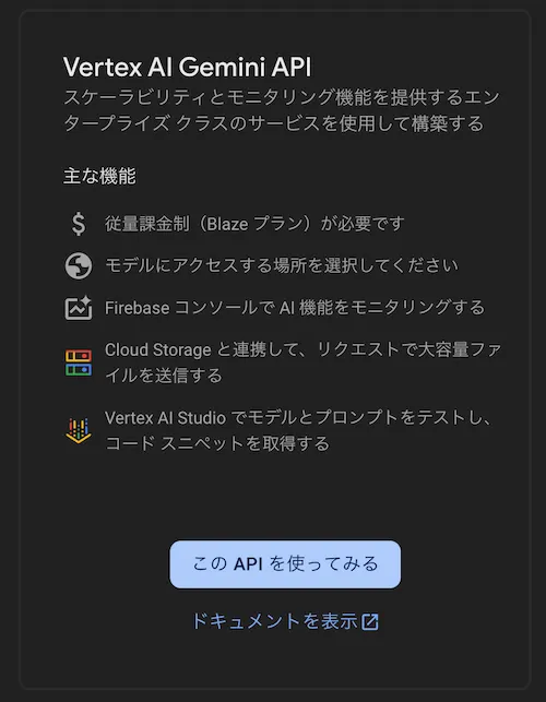 Vertex AI Gemini APIの「このAPIを使ってみる」をクリックします。