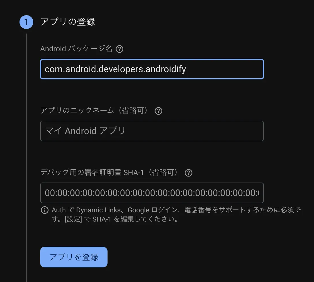 Androidパッケージ名にはcom.android.developers.androidifyを入力します。(この文字列はbuild.gradle.kts (:app)のapplicationIdに書かれている文字列です。)そして、「アプリを登録」をクリックします。