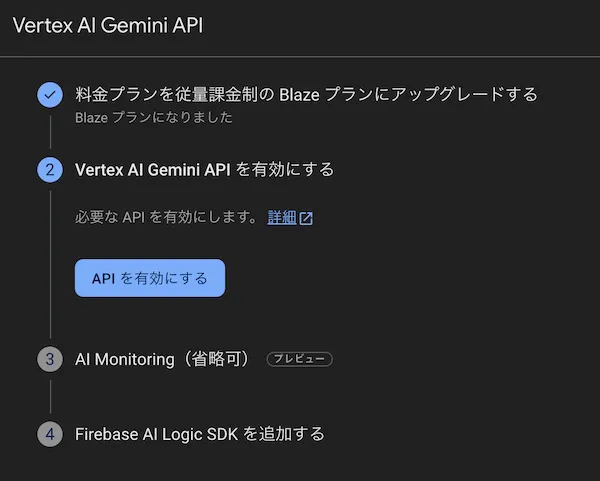 Vertex AI Gemini APIを利用するには、従量課金制のBlazeプランを適用する必要があります。「アップグレード」をクリックし、支払い方法を選択して購入を確定し、プランの変更を完了させます。