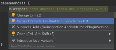 元が4.2.1を使っていたので、build.gradleの該当箇所にマウスを当てると4.2.2へのアップデートを勧められますが、