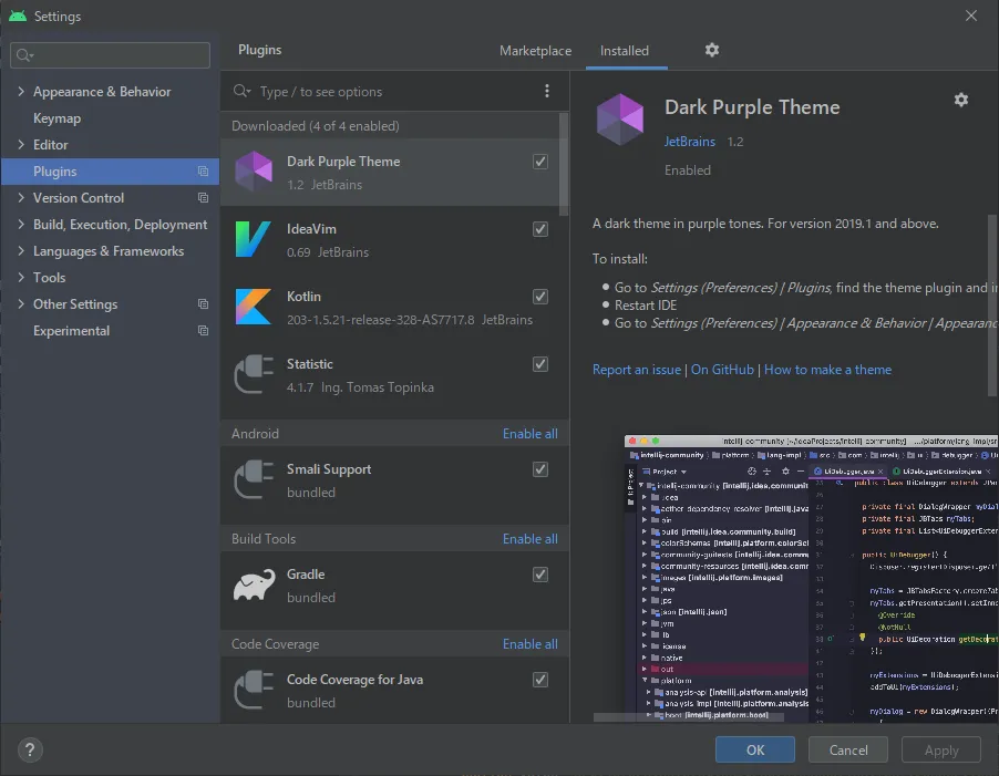 愛用していたDark Purple Themeがなぜか使えなくなりました。プラグインはインストールされているのに、Theme設定から選択できません。調べるとバグ報告されていました。その他のテーマもすべて使えなくなってしまっているようですね。ワークアラウンドも紹介されていますが、次のマイナーリリースで修正されるとのことですので、のんびり待ちたいと思います。というか久しぶりにDarculaを見ると、これはこれでアリだなと感じたので。