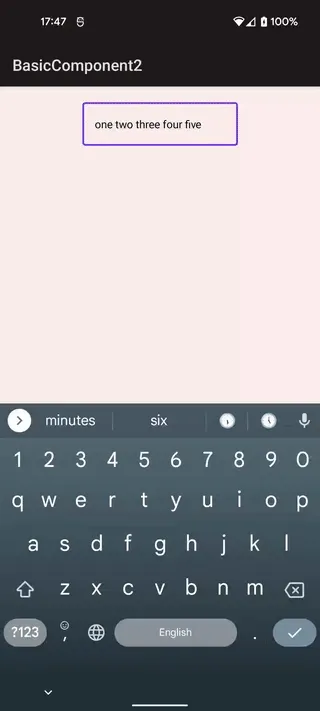 Box( modifier = Modifier.fillMaxSize(), contentAlignment = Alignment.TopCenter) { var text by remember { mutableStateOf("one two three four five") } OutlinedTextField( value = text, onValueChange = { text = it }, modifier = Modifier.padding(20.dp).width(200.dp), singleLine = false, maxLines = 5 )}