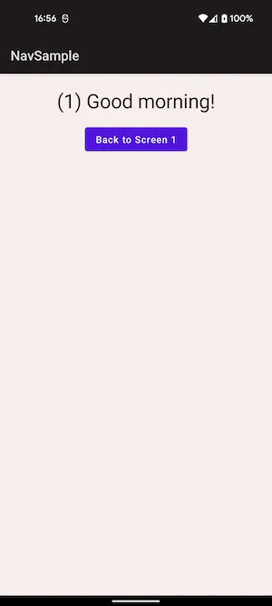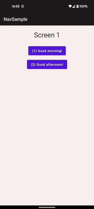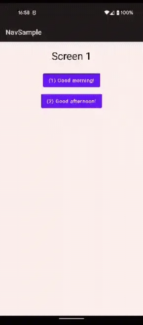 @Composablefun Screen1(onClickButton: (String, Int)->Unit = { _,_ -> }) { Column { Text(text = "Screen 1") Button(onClick = { onClickButton("Good morning!", 1) }) { Text(text = "(1) Good morning!") } Button(onClick = { onClickButton("Good afternoon!", 2) }) { Text(text = "(2) Good afternoon!") } }}