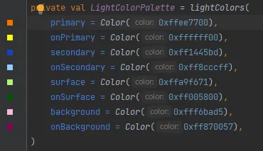 private val LightColorPalette = lightColors( primary = Purple500, primaryVariant = Purple700, secondary = Teal200)darkColors()とlightColors()はどちらもandroidx.compose.materialパッケージに定義されている関数で、マテリアルカラーのセットを保持するColorsオブジェクトを作成して返します。これらの関数を使って、PrimaryやSecondaryなどの色を指定して、Colorsオブジェクトを作成します。ちなみにdarkColors()とlightColors()の定義は以下のようになっていて、すべてのパラメータに初期値がセットされていますので、自分が変更したい色だけ指定すればOKです。