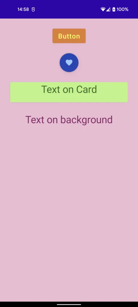 TestAppTheme { Surface( modifier = Modifier.fillMaxSize(), color = MaterialTheme.colors.background ) { Column( verticalArrangement = Arrangement.spacedBy(30.dp), horizontalAlignment = Alignment.CenterHorizontally, modifier = Modifier.padding(30.dp) ) { Button(onClick = {}) { Text( text = "Button", fontSize = 20.sp ) } FloatingActionButton( onClick = {}, ) { Icon( imageVector = Icons.Filled.Favorite, contentDescription = null ) } Card( modifier = Modifier.fillMaxWidth() .height(60.dp) ) { Text( text = "Text on Card", fontSize = 30.sp, textAlign = TextAlign.Center ) } Text( text = "Text on background", fontSize = 30.sp ) } }}