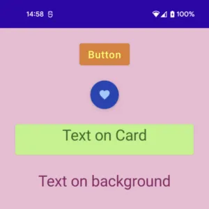 internal object FilledCardTokens { val ContainerColor = ColorSchemeKeyTokens.SurfaceVariant val ContainerElevation = ElevationTokens.Level0 val ContainerShape = ShapeTokens.CornerMedium val DraggedContainerElevation = ElevationTokens.Level3 val DraggedStateLayerColor = ColorSchemeKeyTokens.OnSurface val FocusContainerElevation = ElevationTokens.Level0 val FocusStateLayerColor = ColorSchemeKeyTokens.OnSurface val HoverContainerElevation = ElevationTokens.Level1 val HoverStateLayerColor = ColorSchemeKeyTokens.OnSurface val IconColor = ColorSchemeKeyTokens.Primary val IconSize = 24.0.dp val PressedContainerElevation = ElevationTokens.Level0 val PressedStateLayerColor = ColorSchemeKeyTokens.OnSurface}したがって、Cardの見た目をM2とM3で同じにするのであれば、Theme.ktでcolorSurfaceVariantとonColorSurfaceVariantにそれぞれcolorSurfaceとonColorSurfaceと同じ色を設定すればよいことになります。