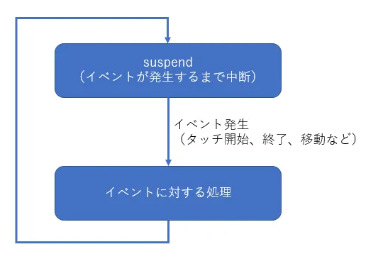 fun Modifier.pointerInput(key1: Any?, block: suspend PointerInputScope.() -> Unit): Modifier引数のblockは、PointerInputScopeをレシーバとするsuspend関数です。なぜsuspend関数になっているかというと、ジェスチャー検出処理がsuspend関数で構成されているからです。ジェスチャー検出処理は、タッチ開始・移動・終了などのジェスチャーイベントを待っている間は中断(suspend)して、イベントが発生したらそのイベントに対する処理を行い、次のイベントが発生するまでまた中断する、というのを繰り返します。そのため、suspend関数で実装する必要があるのです。