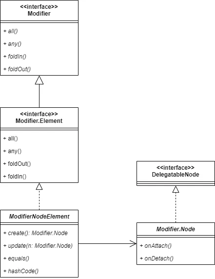 最上位に位置するのは、Modifierインターフェースです。Modifierには、all、any、foldIn、foldOutといったModifierチェーンを実現するためのメソッドが定義されています。