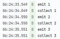 init { viewModelScope.launch { delay(1500) sharedFlow.onEach { Log.d("FlowSample", "collect $it") }.collect() } viewModelScope.launch { repeat(3) { delay(1000) Log.d("FlowSample", "emit $emitValue") sharedFlow.emit(emitValue) emitValue++ } }}