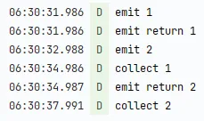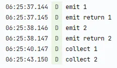 init { viewModelScope.launch { sharedFlow.onEach { delay(3000) Log.d("FlowSample", "collect $it") }.collect() } viewModelScope.launch { repeat(2) { delay(1000) Log.d("FlowSample", "emit $emitValue") sharedFlow.emit(emitValue) Log.d("FlowSample", "emit return $emitValue") emitValue++ } }}