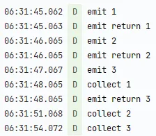 init { viewModelScope.launch { sharedFlow.onEach { delay(3000) Log.d("FlowSample", "collect $it") }.collect() } viewModelScope.launch { repeat(3) { delay(1000) Log.d("FlowSample", "emit $emitValue") sharedFlow.emit(emitValue) Log.d("FlowSample", "emit return $emitValue") emitValue++ } }}