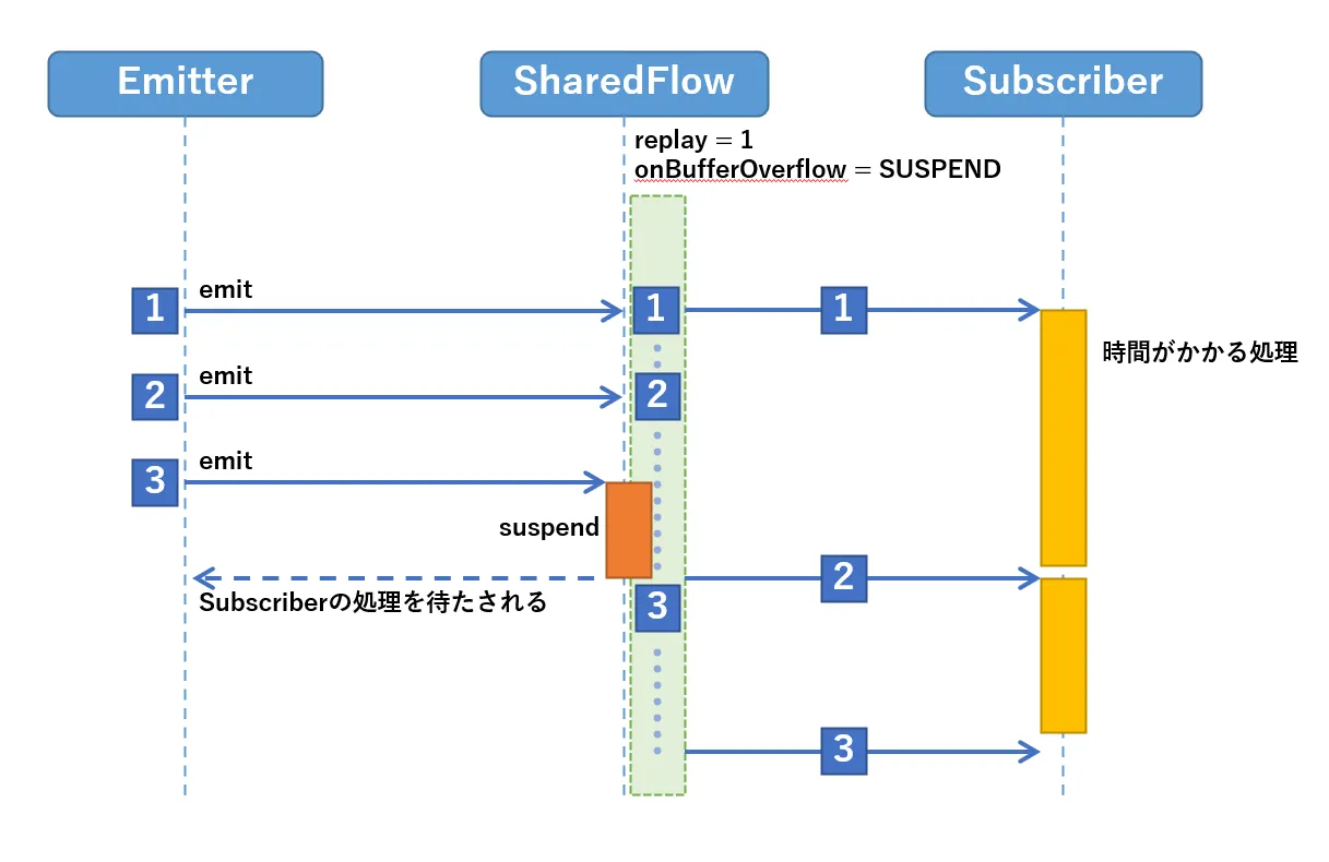 extraBufferCapacityはemitされた値を格納しておくバッファのサイズです。Subscriberの処理を待っている間、このバッファに値をためておくことができます。